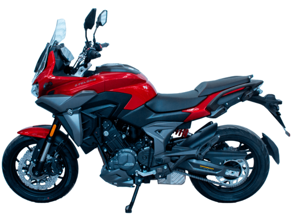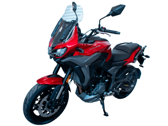 Мотоцикл CYCLONE RX401 2025 – туристический эндуро, готовый бросить вызов любым дорогам и расстояниям. За его рулём для вас не будет невозможных маршрутов!Оснащён рядным 2-цилиндровым 4-тактным двигателем DOHC объёмом 401 см³ с 4 клапанами на каждом цилиндре. Двигатель способен обеспечить мощность в 42,8 л.с. при 9500 об/мин, а максимальный крутящий момент 37 Н·м достигается на 8000 об/мин. Соотношение диаметра цилиндра и хода поршня 68х55,2 мм. Степень сжатия 11,6:1.Жидкостная система охлаждения не допустит перегрева двигателя даже при самом агрессивном вождении. Механическая коробка передач имеет 6 ступеней со схемой 1-N-2-3-4-5-6. Объём топливного бака 20 литров.Максимальная скорость мотоцикла 139 км/ч.Мотоцикл оснащён спицованными алюминиевыми колёсами диаметром 19 дюймов спереди и 17 сзади. Колёса обуты в бескамерные покрышки CST. В качестве передней подвески используется телескопическая вилка перевёрнутого типа, а сзади установлен маятник с моноамортизатором. Ход передней подвески 130 мм, задней – 55 мм. Оба компонента подвески регулируются. Для эффективного торможения используются гидравлические дисковые тормоза с 2-канальной ABS системой. Тормоза спереди представлены 2 тормозными дисками диаметром 305 мм с 4-поршневыми саппортами, а сзади расположен тормозной диск 258 мм с однопоршневым суппортом с плавающей скобой.Мотоцикл имеет продуманную конструкцию с высоко расположенным радиатором.Для освещения и сигнальных огней используется диодная светотехника. Данные от бортового компьютера выводятся на яркий цветной дисплей, оснащённый специальным козырьком для защиты от брызг и бликов. Имеются подсветка пультов, USB-порт, 12-вольтная розетка.Габариты 2160x860x1395 мм, снаряжённая масса 215 кг. Колёсная база 1410 мм, клиренс 185 мм, высота по седлу 810 мм.
