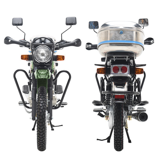 Комплектация На переднем колесе установлен дисковый тормоз, хотя в ступице заднего колеса реализован проверенный многими десятилетиями вариант с тормозом барабанного типа.Широкое комфортное сиденье.багажник, складывающиеся пассажирские подножки и наличие мощной центральной подножки. Безопасность эксплуатации на дорогах общего пользования обеспечивают обязательный комплект зеркал заднего вида