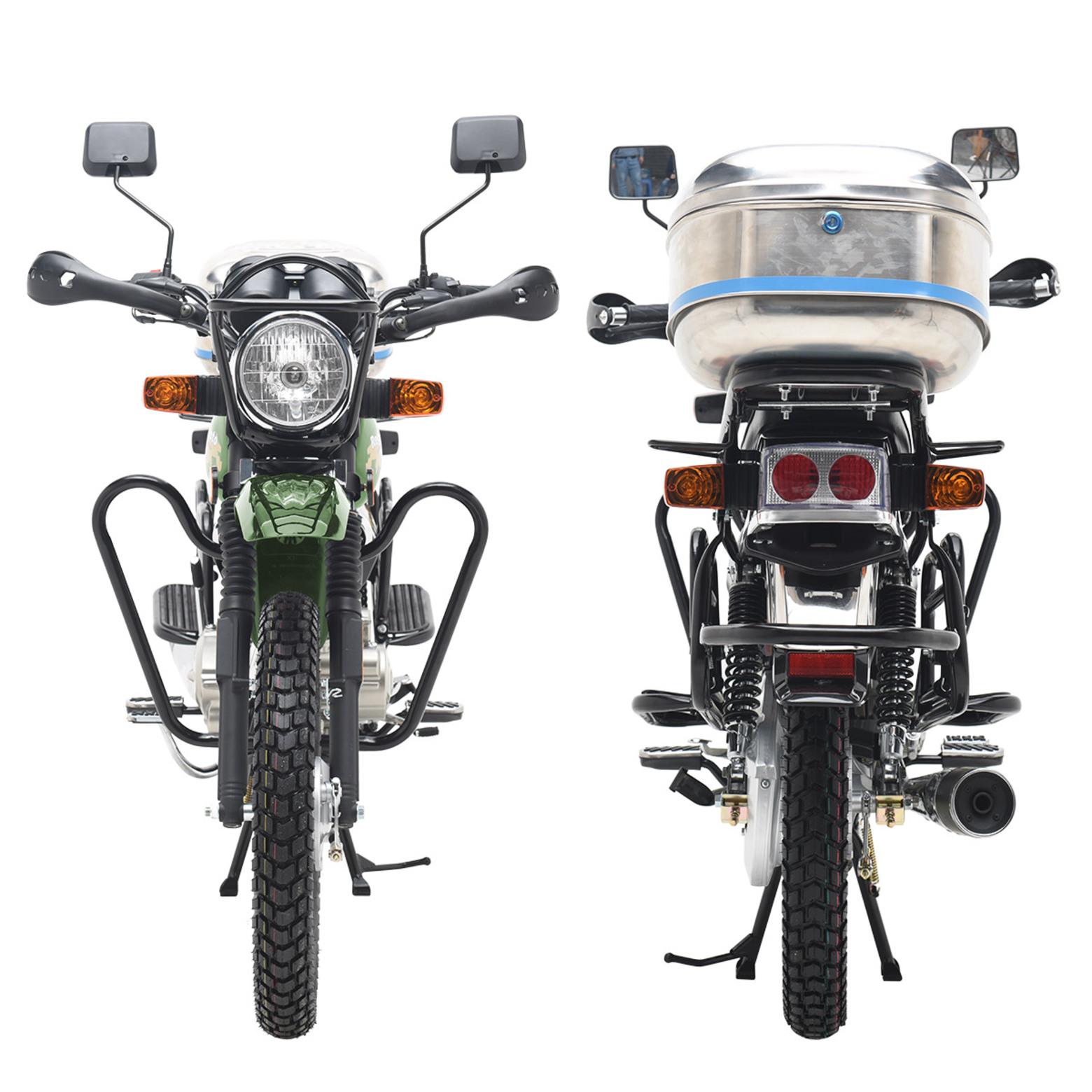 Комплектация Тормоза барабанные, цепь 428Н, защита рук, клетка, кофр, зеркала заднего вида, центральная и боковая подножки.