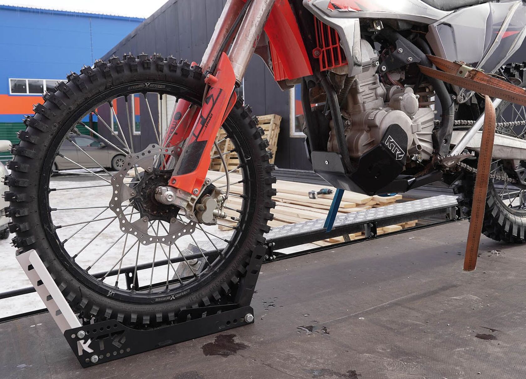 • Универсальная ловушка для переднего колеса мотоцикла (мотоловушка) предназначена для транспортировки и хранения кроссовых и эндуро мотоциклов. Позволяет быстро и надёжно зафиксировать переднее колесо, обеспечивая устойчивость и предотвращая смещение в процессе перевозки.