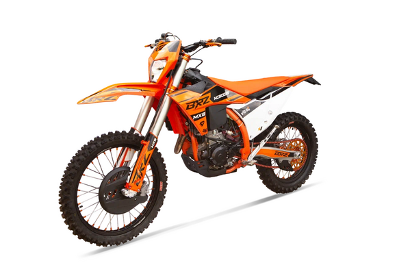 Полноразмерный мотоцикл BRZ MX8 NC300s 24, топовый в линейке. Колесная база 1490 мм. Мотор жидкостного охлаждения, 2 распредвала. КПП на 6 передач. Пластик KTM 24. Характеристики: Кубатура – 300cc