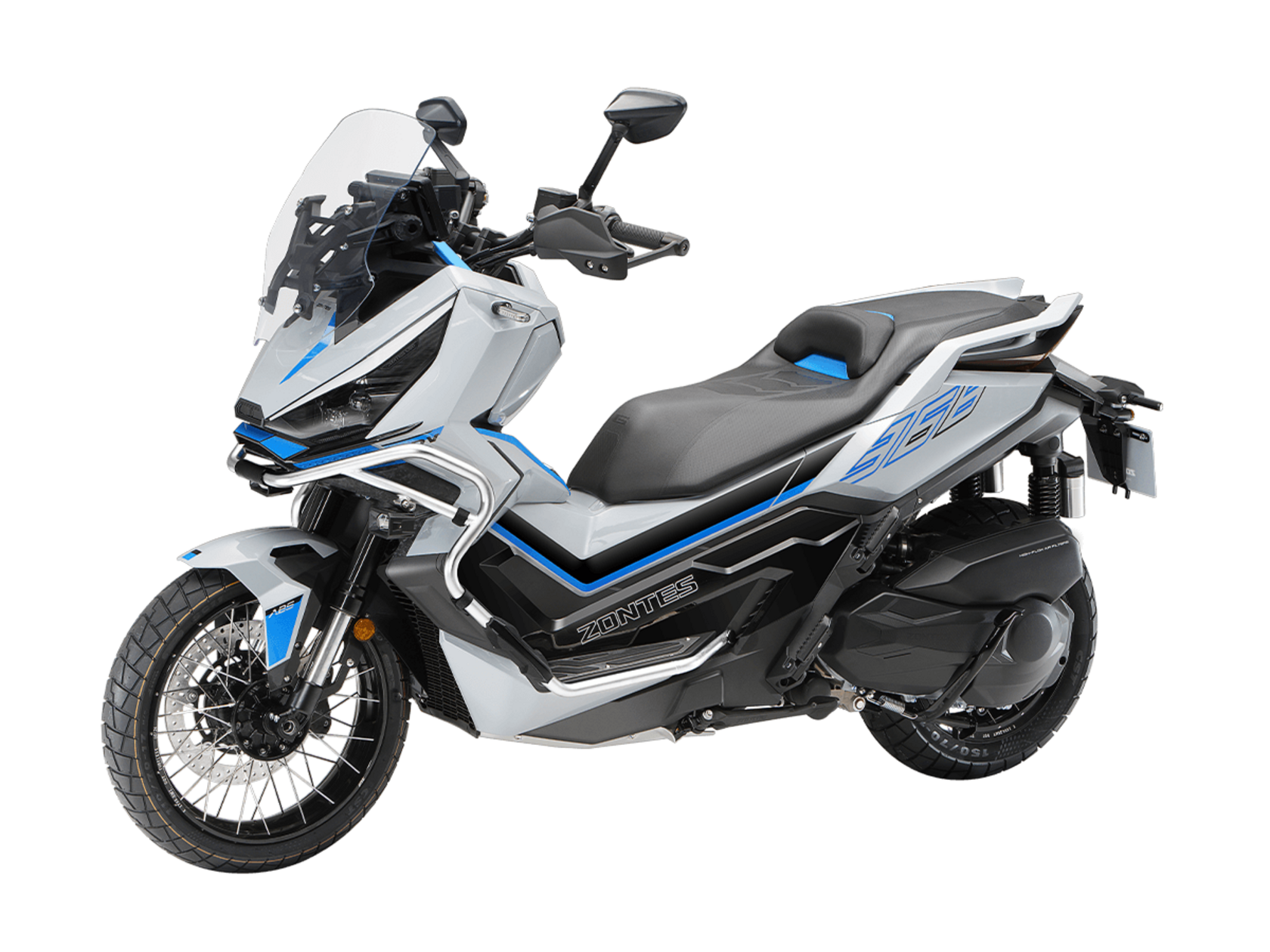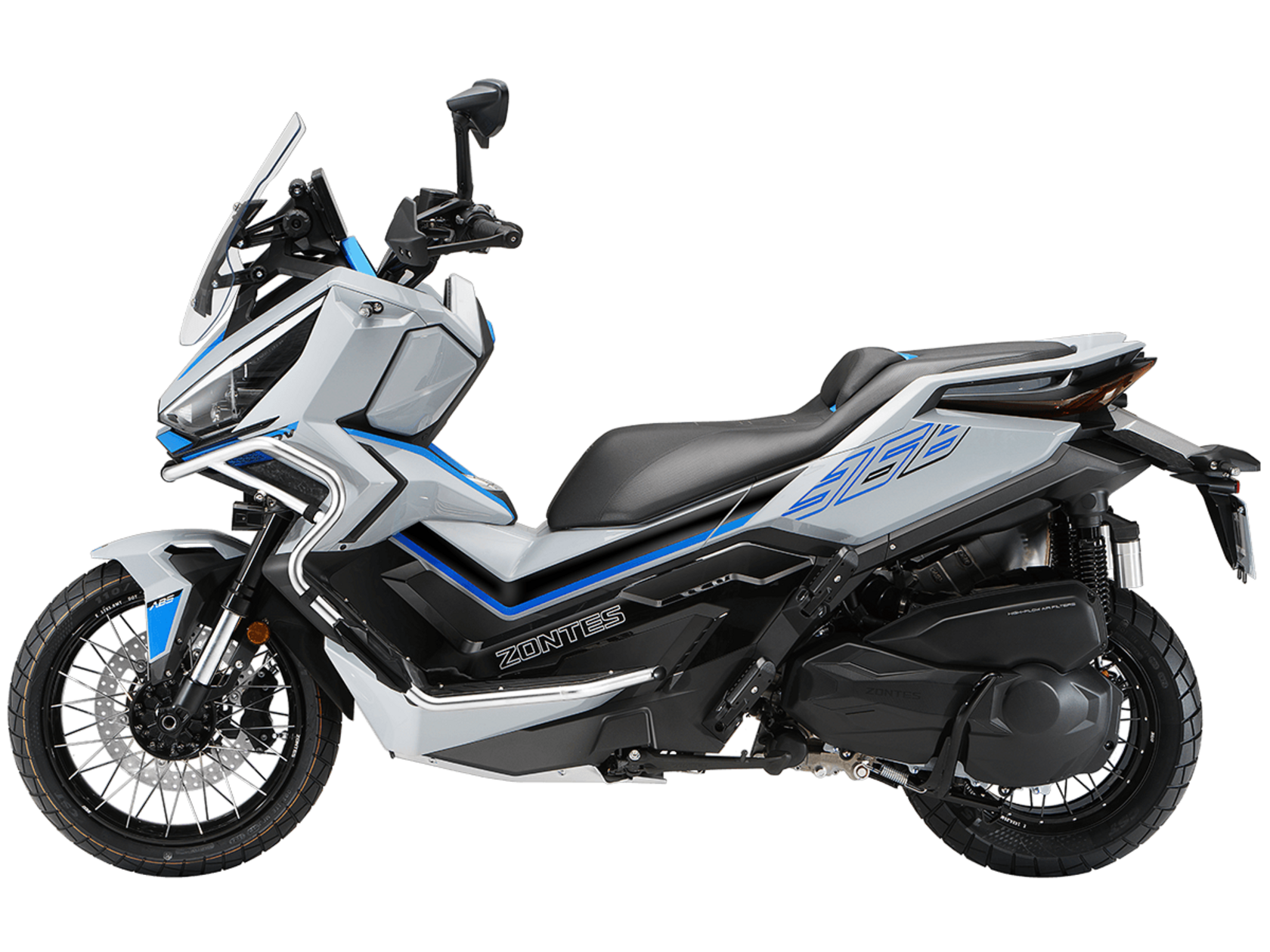 Скутер ZONTES ZT368-G – максискутер двойного назначения, готовый пронестись по улицам города за его пределы и отправиться по грунтовым тропам прокладывать свой маршрут туда, куда вам потребуется. Регулируемая подвеска с перевёрнутой телескопической вилкой спереди обеспечит отличную управляемость и устойчивость в любых условиях.Силовая установка представлена одноцилиндровым 4-тактным двигателем. Двигатель имеет объём 368 см³ и обеспечивает мощность в 38,8 л.с. Оснащён инжектором BOSCH, системой жидкостного охлаждения и вариатором. Запуск двигателя осуществляется с помощью бесключевого доступа.Ёмкость топливного бака 17,5 литра.Колёса имеют диаметр 17 дюймов спереди и 14 дюймов сзади. Для подвески спереди используется телескопическая вилка перевёрнутого типа, а сзади установлены 2 гидравлических амортизатора. Гидравлические дисковые тормоза произведены компанией J.JUAN, входящей в холдинг BREMBO. Мотоцикл также оснащён 2-канальной ABS-системой, противобуксовочной системой TCS System и датчиками давления в шинах.ZT350-G оборудован яркой LED-фарой, мультимедийной приборной панелью с TFT-дисплеем, имеются 2 USB-порта.Габариты скутера 2230х925х1290 мм. Колёсная база 1560 мм. Высота по седлу 795 мм. Вес 198 кг.