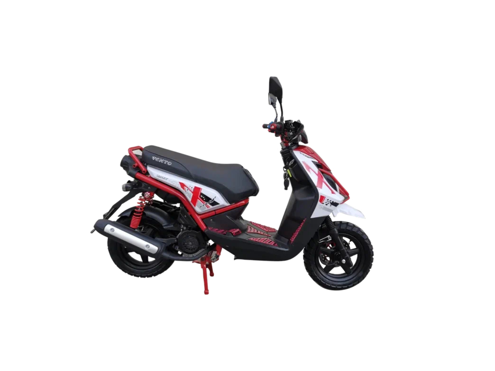 Скутер VENTO Smart ll – это компактная и доступная модель с 12-дюймовыми колесами. Его корпус по стилю стал репликой известного байка Yamaha BWS. Внедорожный дизайн техники дополняет практичная пластиковая защита для рук. Пространственная рама делает удобным использование транспорта для высоких водителей.Венто Смарт идеально подходит как поездок по городу, так и выездов на дачу. При этом эффективное сцепление с различным дорожным покрытием обеспечивает внедорожный протектор шин. Поставка в комплекте сигнализации с автоматическим запуском гарантирует безопасность и спокойствие владельцу.Движущую силу малолитражного байка производит 49-кубовый мотор с воздушным охлаждением, выдающий мощность порядка 10,8 л.с. Дополняется он обычным карбюратором и вариатором.