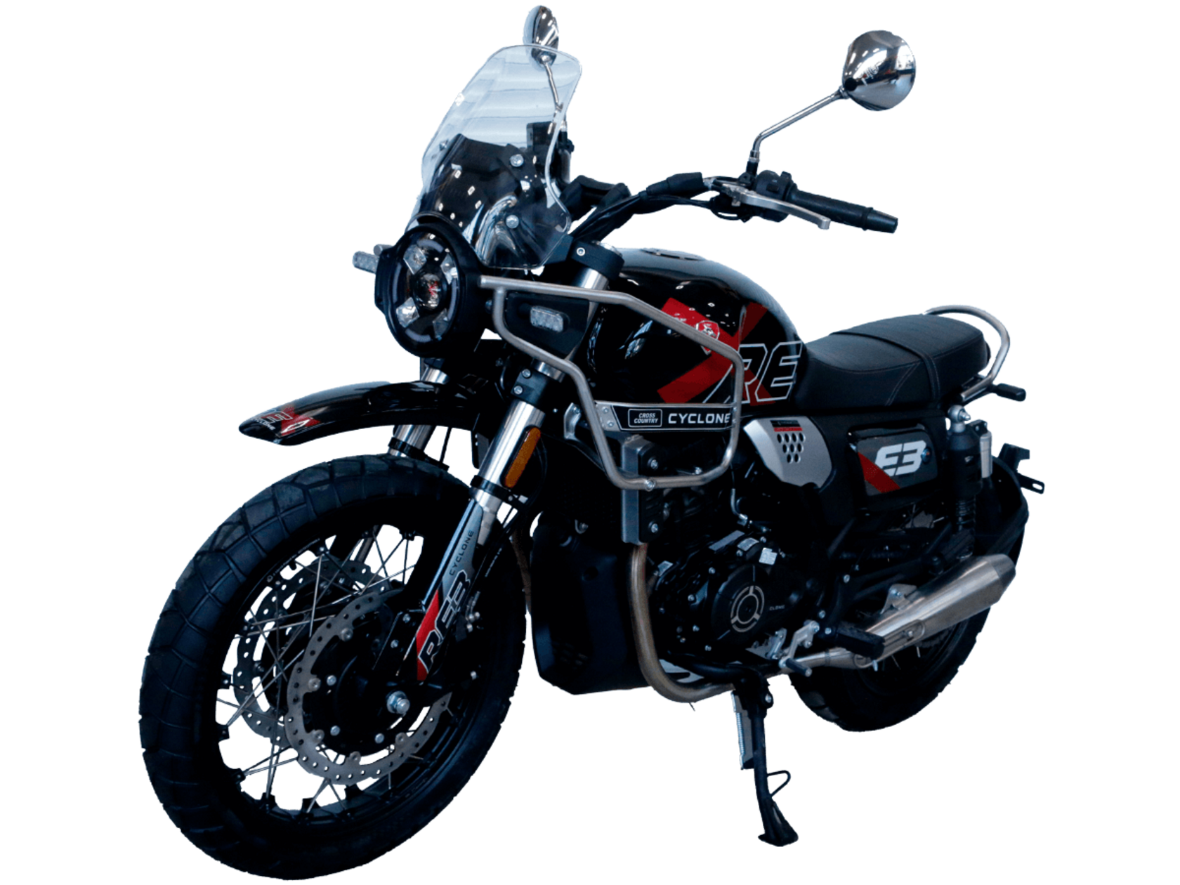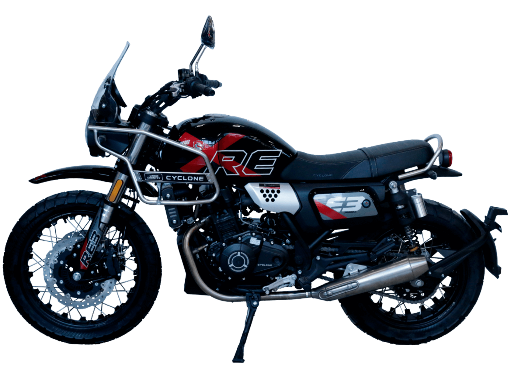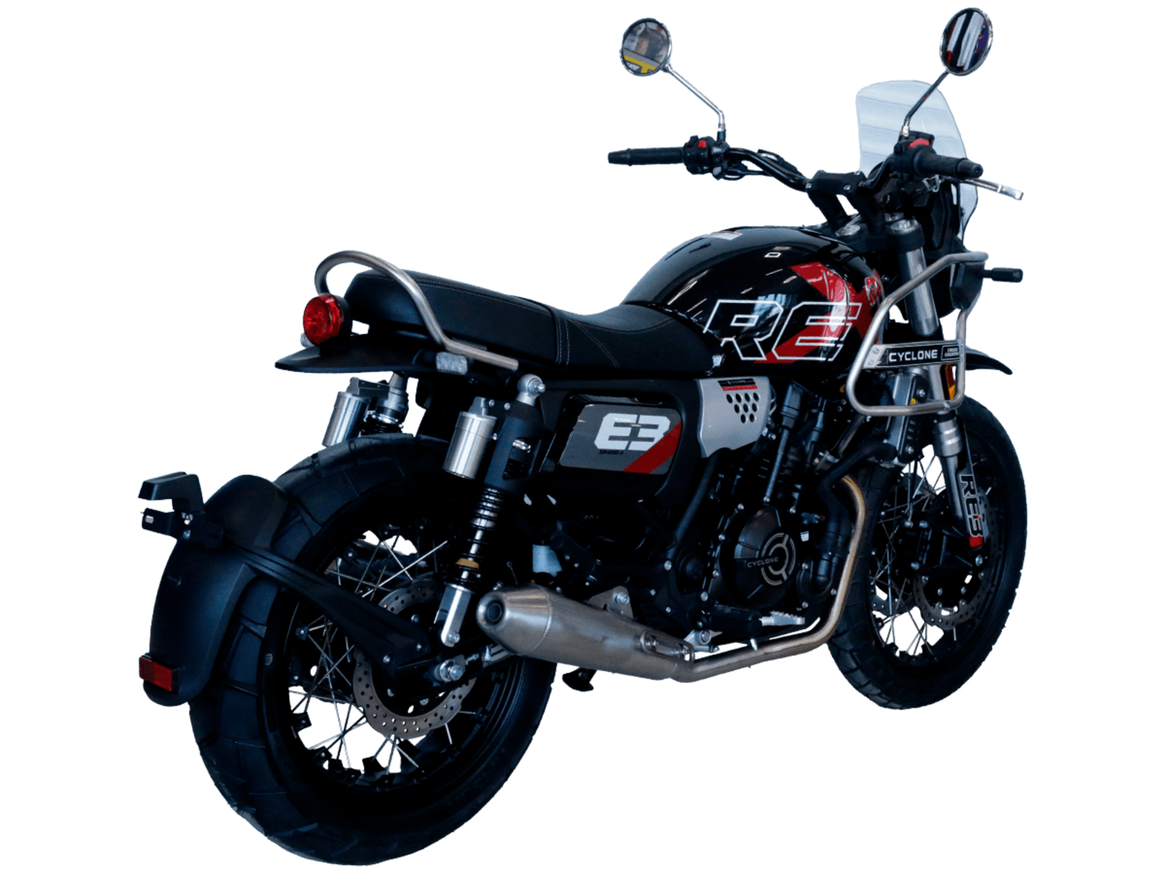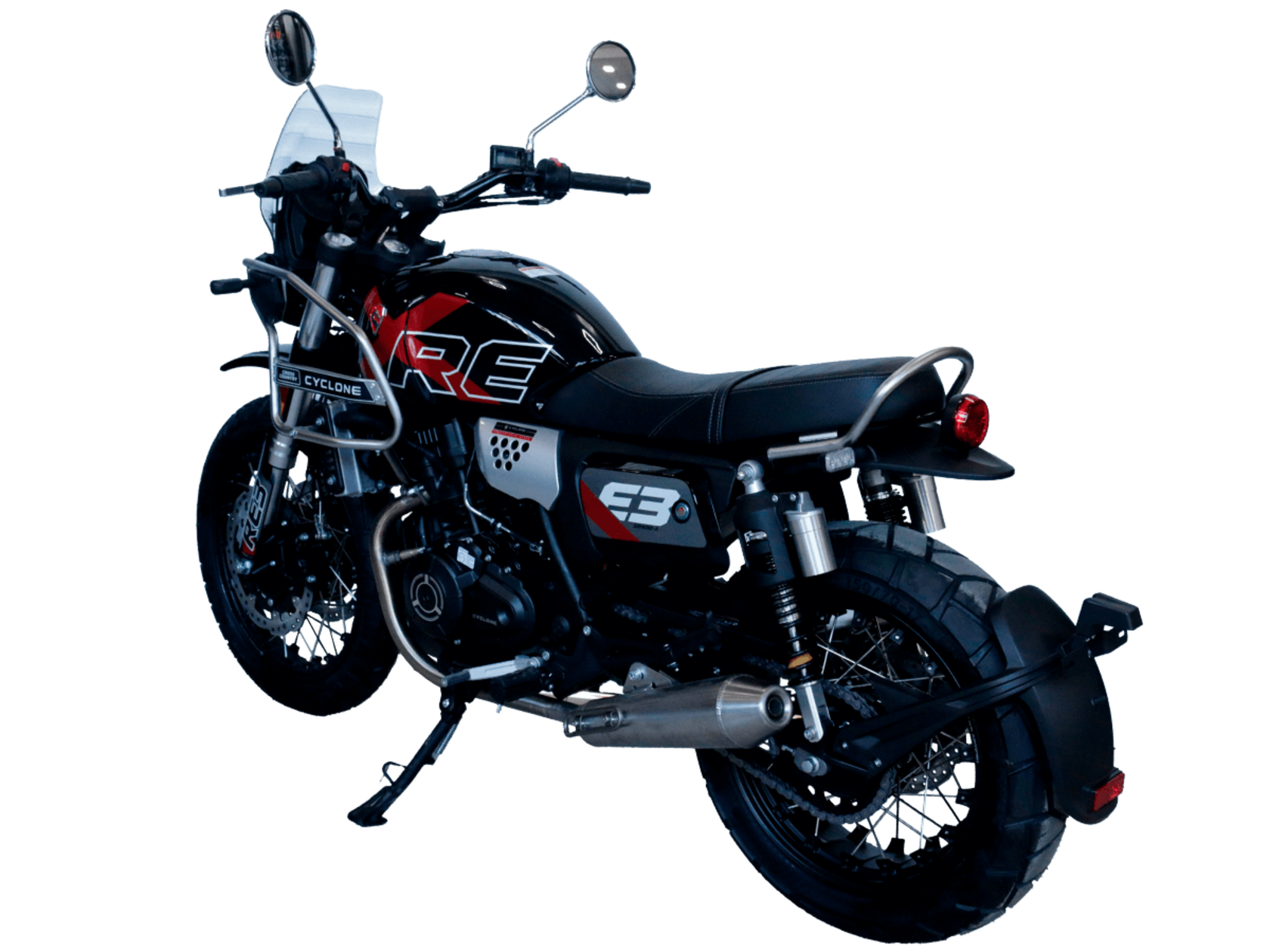 CYCLONE RE3 Scrambler (SR400-A) – универсальный мотоцикл, объединяющий в себе черты городского мотоцикла и эндуро. Управляя им, можно бросить вызов и городским пробкам, и скоростным автострадам, и всевозможному лёгкому бездорожью. Его дизайн отдаёт дань уважения каферейсерской тематике.Двухцилиндровый четырёхтактный двигатель объёмом 401 см3 выдаёт 43 л.с. на 9500 об/мин. Инжекторный впрыск топлива с инжектором BOSCH увеличивает топливную экономичность, а также позволяет добиться высокой приёмистости и неприхотливости агрегата. Жидкостная система охлаждения не допустит перегрева двигателя даже при самом агрессивном вождении. На мотоцикл установлена 6-ступенчатая механическая коробка передач.Максимальная скорость мотоцикла составляет 140 км/ч.Мотоцикл оснащён классическими спицованными колёсами диаметром 17 и 19 дюймов и имеет достаточно большой дорожный просвет – 22 см. С неровностями дороги эффективно справляются телескопическая вилка перевёрнутого типа спереди и маятник с двумя амортизаторами сзади. Ход передней подвески составляет 130 мм, задней – 81 мм. Оба компонента подвески являются регулируемыми. Эффективное и безопасное замедление с любых скоростей обеспечивают гидравлические дисковые тормоза с ABS спереди и сзади.Клиренс мотоцикла составляет 220 мм. Объём топливного бака – 19 л. Снаряжённая масса – 200 кг.На данной модели штатно установлены дуги безопасности, а также имеется бортовой компьютер с цветным дисплеем, USB-порт и подсветка пультов.RE3 Scrambler сочетает в себе отличные технические характеристики, комфорт и надёжность, что позволяет вам ощутить настоящую свободу на любой дороге с любым покрытием.
