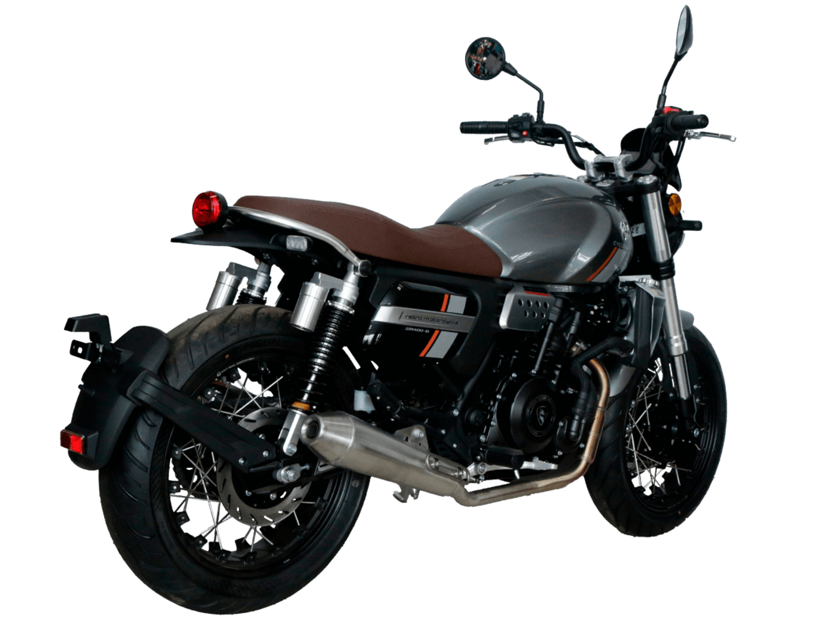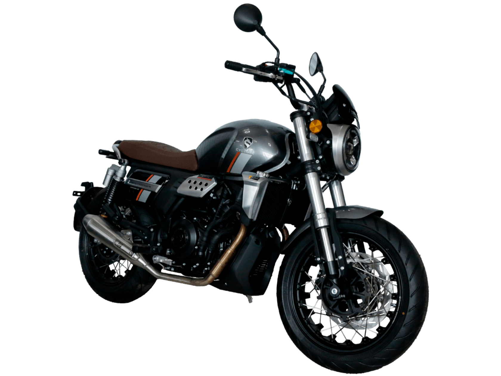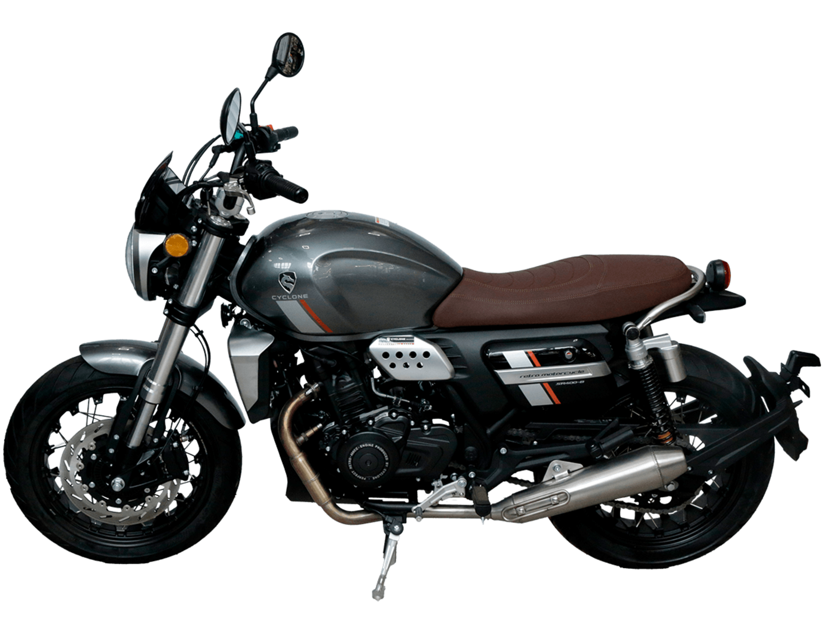 CYCLONE RE401 (SR400-B) 2024 – классик, в котором подчёркнутая простота объединяется с современными технологиями. Данная модель является более продвинутой версией модели RE3 (SR-400) – мотоцикл обладает более современным дизайном, снабжён стильными металлическими накладками на радиатор, а также топливным баком, объём которого увеличен до 20 литров.Двухцилиндровый четырёхтактный двигатель объёмом 401 см3 выдаёт 43 л.с. на 9500 об/мин. Инжекторный впрыск топлива с инжектором BOSCH увеличивает топливную экономичность, а также позволяет добиться высокой приёмистости и неприхотливости агрегата. Жидкостная система охлаждения не допустит перегрева двигателя даже при самом агрессивном вождении. На мотоцикл установлена 6-ступенчатая механическая коробка передач.Максимальная скорость мотоцикла составляет 150 км/ч.RE401 оснащён классическими спицованными колёсами диаметром 17 дюймов. Колёса обуты в бескамерные покрышки TIMSUN. С неровностями дороги эффективно справляются телескопическая вилка перевёрнутого типа спереди и маятник с двумя амортизаторами сзади. Ход передней подвески составляет 130 мм, задней – 81 мм. Оба компонента подвески являются регулируемыми. Эффективное и безопасное замедление с любых скоростей обеспечивают гидравлические дисковые тормоза с ABS спереди и сзади.Клиренс мотоцикла составляет 170 мм. Объём топливного бака – 20 л. Снаряжённая масса – 186 кг.Из дополнительного оборудования можно выделить USB-порт и датчики давления в шинах.Мотоцикл сочетает в себе отличные технические характеристики, комфорт и надёжность, что позволяет вам ощутить настоящую свободу на любой дороге.