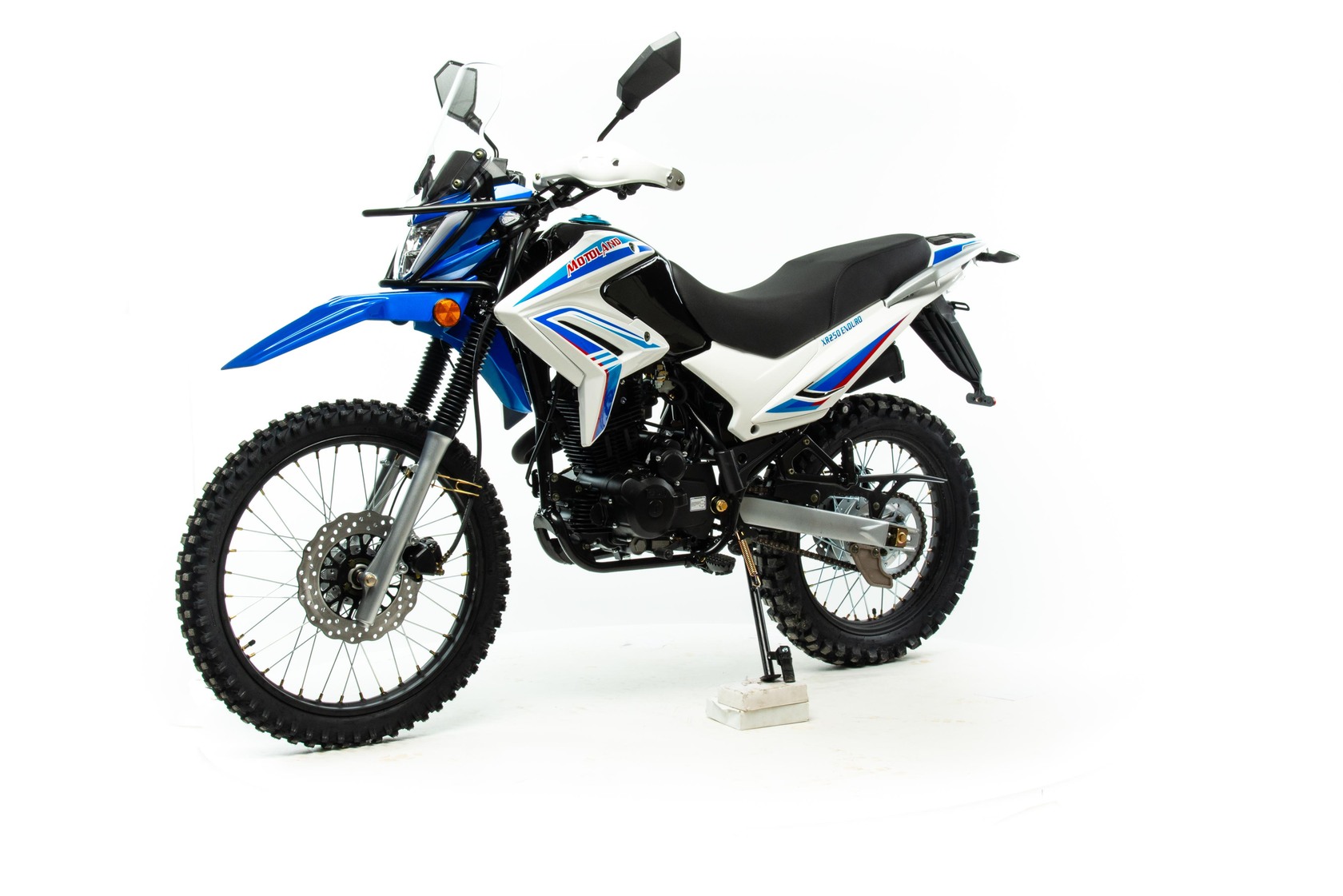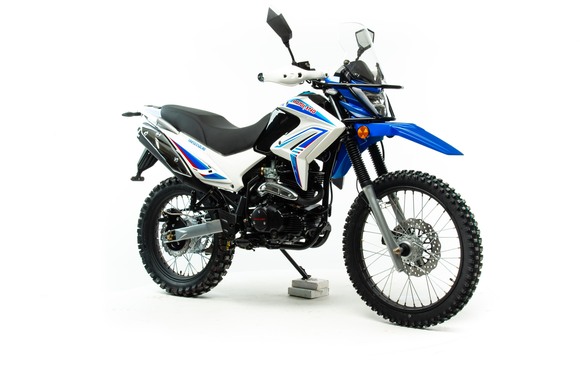 Обновленный мотоцикл Motoland XR250 ENDURO 165 предназначен для езды по бездорожью, эндуро соревнований, подходит для города, шоссейных и сельских дорог.Motoland XR250 ENDURO 165 отличаются высокой проходимостью, отлично ведут себя на мягком грунте и песке, легко преодолевают препятствия. Спортивный характер XR250 ENDURO подчёркивается современным дизайном. Классическая конструкция акцентирует внимание на сильных сторонах мотоцикла, которому не страшны грязь, брёвна, камни и другие преграды. Мотолэнд XR250 ENDURO весит 130 кг и подходит для пользователей любого роста, хорошо держит баланс и позволяет уверенно сохранять равновесие даже на сложных участках эндуро трасс. Колёса спицованные, сделаны из алюминия. Размер переднего колеса — 21 дюйм (530 мм), заднего — 18 дюймов (450 мм). Передние и задние тормоза дисковые. Покрышки с крупными шипами подходят для бездорожья, лесных дорог, песка и мягкого грунта. При этом купить мотоцикл Эндуро можно не только для соревнований, но и для езды по трассе и городу. Передняя вилка — классического типа. Задняя подвеска с моноамортизатором. Руль Эндуро усилен пластиковыми рамками, которые защищают руки гонщика от веток и травм при падениях. Приборная панель оснащена ЖК-экраном, на котором отображается вся информация о состоянии Эндуро: обороты, пробег, скорость и другие необходимые данные. Китайский Эндуро компании MotoLand оснащён одноцилиндровым 4-тактным двигателем 165 FMM с воздушным охлаждением. Мотор мощностью 16,3 л. с. и объёмом 250 см³ даёт возможность разгоняться на Эндуро по ровной трассе до 120 км/ч. Расход топлива — 5 литров на 100 км. Коробка передач механическая, 5-скоростная. Для запуска мотора используйте электростартёр или кикстартёр. Установлена электронная система зажигания (CDI). У нас Вы можете купить этот мотоцикл с бесплатной доставкой по РФ и гарантией до года. Также его можно приобрести в рассрочку или в кредит.