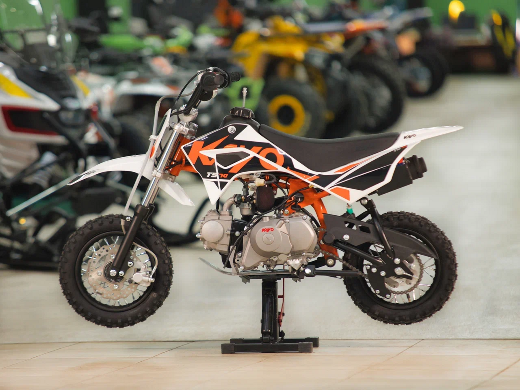 Питбайк KAYO Mini TS70 10/10 – идеальный снаряд для юных экстремалов, который можно использовать на лёгких кроссовых трассах и дорогах с различным покрытием. Удобный, простой и надёжный мотоцикл, который полностью оправдывает свою цену.Одноцилиндровый 4-тактный двигатель воздушного охлаждения YX1P47FMD объёмом 72 см3, выдаёт 5 л.с. Карбюратор JK PZ19 обеспечивает бесперебойную работу техники в самых жёстких условиях эксплуатации, простоту и лёгкость в обслуживании, а также неприхотливость к качеству топлива. Питбайк оснащён автоматической коробкой передач, что позволит райдерам полностью сосредоточиться на управлении питбайком.Аппарат имеет вес всего 52 кг. Усиленная рама из хром-молибденового сплава и подвеска позволяют эффективно амортизировать удары при езде по неровностям и препятствиям на трассе. Передняя подвеска – телескопическая вилка длиной 540 мм, задняя – моноамортизатор 255 мм. Рама и пластик являются собственной разработкой производителя. Мотоцикл оснащён классическими стальными спицованными колёсами диаметром 10 дюймов. Эффективное и безопасное замедление с любых скоростей обеспечивают гидравлический дисковый тормоз спереди и барабанный – сзади. Высококачественная износостойкая резина с развитым протектором отлично держит дорогу на различных типах покрытия. Байк оснащён системой запуска двигателя при помощи кнопки электростартера.Если вы ищете послушный, компактный, шустрый, красивый питбайк для своего малыша, считайте, что вы его нашли.