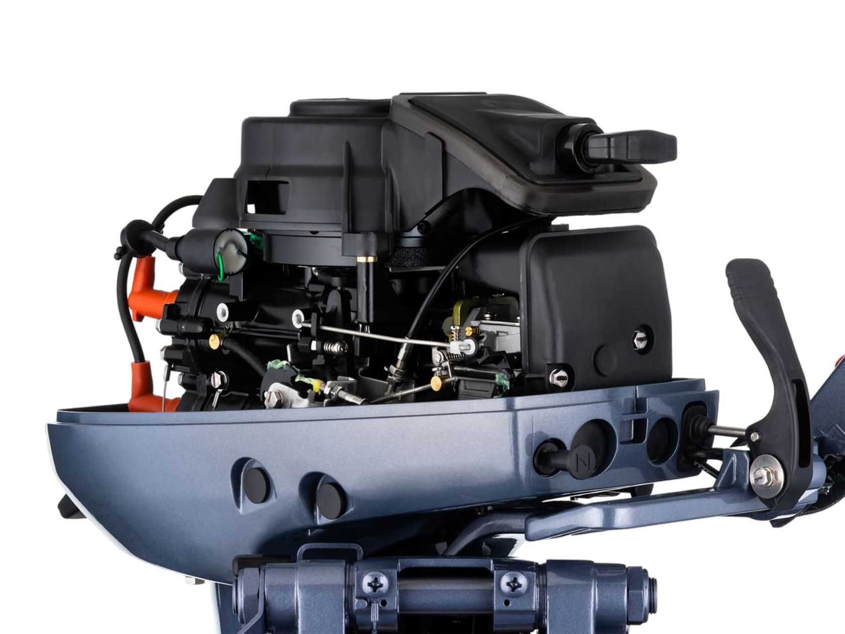 Обновленный дизайн капота 2-тактного лодочного мотора Mikatsu M9.9FHS, во-первых, позволил ему стать еще более крепким за счет боковых ребер жесткости. Во-вторых, позволил увеличить комфорт шкипера за счет более широкой и эргономичной ручки, которая стала располагаться ближе к шкиперу, и поднимать мотор при подходе к берегу стало гораздо удобнее. Кроме того, ручка выполняет две функции.Помимо своего прямого назначения, ручка – это еще и клапан, через который в подкапотное пространство попадает воздух для работы двигателя и в тоже время не попадает вода. Капот стал выше, и поток воздуха к карбюратору стал больше, за счет этого мотор стал еще динамичнее, чем раньше.Подвесной лодочный мотор Mikatsu (Микатсу) M9.9FHS является самым популярным и востребованных на рынке. Идеальная эксплуатация мотора – это 1-2 человека на лодке 340-360 см.Для этого 2-х тактного двухцилиндрового двигателя объемом 246 см3 характерна высокая производительность при сравнительно малом весе. Кстати, 9,9 л. с. сделаны неспроста, ведь это максимальное значение, когда на пользование мотором не требуются регистрационные документы. Вес мотора составляет 36 кг, расход топлива 5 л/час. Идущего в комплекте поставки внешнего бензобака на 24 л хватит продолжительное время работы.Коробка передач имеет три положения – нейтральное для запуска двигателя, переднюю и заднюю скорости. Различные режимы крепления двигателя позволят преодолевать мелководья без ущерба для винта. Усовершенствованная цифровая система зажигания CDI позволит с легкостью осуществить запуск двигателя в любых условиях, а инновационная оригинальная система подачи топлива Mikatsu (Микатсу) даст значительную экономию расхода топлива. Пятислойное лакокрасочное покрытие не только придает этому мотору красивый внешний вид, но и прекрасно защищает его от воздействия агрессивной внешней среды и дольше будет сохранять внешнее состояние мотора в эстетически достойном виде.